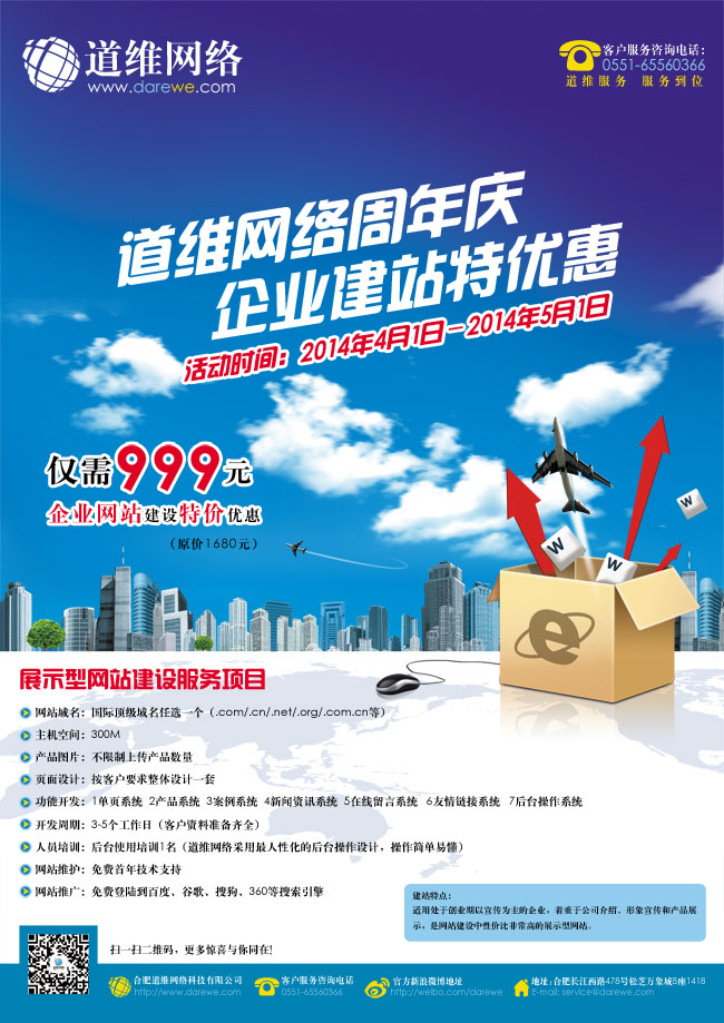 最優(yōu)惠套餐為“展示型網站建設服務項目”原價為1680的展示型企業(yè)網站建設,活動期間僅需999元,掃描道維官方微信二維碼更有驚喜。